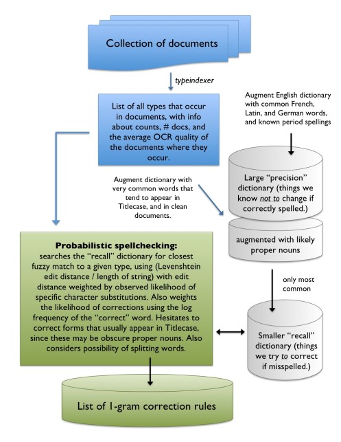 I’m now about halfway through designing a workflow to do probabilistic correction on 500,000 HathiTrust documents, and thought I would share my workflow in case people have suggestions or critiques. Click to enlarge.